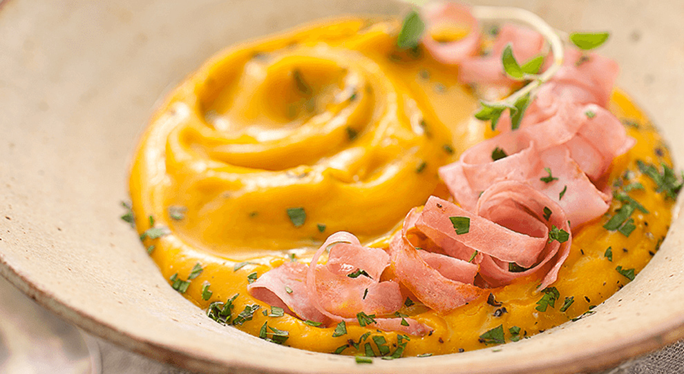 O Creme de Abóbora com Presunto e Manjericão Fresco é uma alternativa deliciosa para iniciar a celebração do Dia das Mães. Nesse prato, a abóbora é cozida até ficar macia e cremosa e ganha um sabor extra, graças às tiras de presunto defumado, que se complementam perfeitamente.