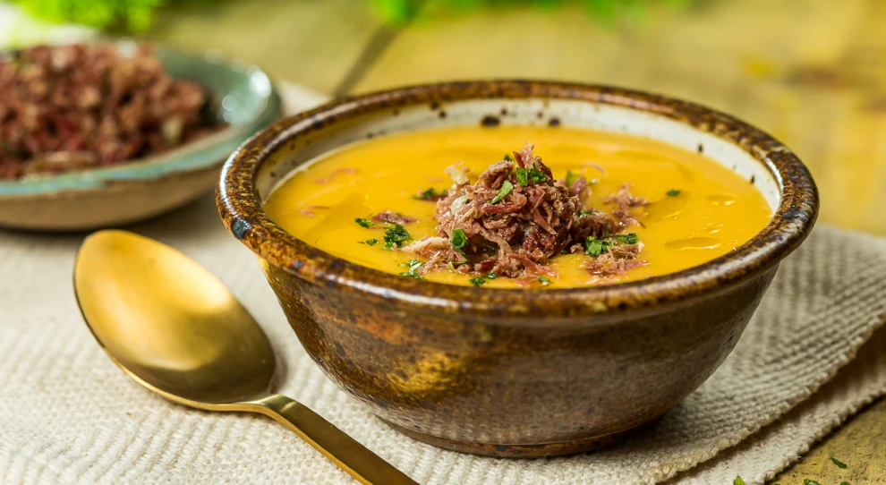 1) Caldo de mandioquinha com jerked beef
