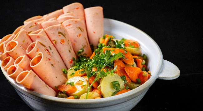 Essa receita é uma versão alemã da tradicional salada Waldorf. A paprika fleischwurst é uma refeição saudável, feita com batata e cenoura. O segredo dessa comida alemã está nos temperos especiais: pimenta-do-reino, sal, salsa, cebolinha, limão sicialiano e dill. Para dar o toque especial, acrescenta-se ainda o salsichão. Ele dá mais textura e deixa o sabor mais intenso. O Salsichão com Picles Hans é uma carne suína magra selecionada, perfeita para essa receita. Sua massa traz pedaços de cenoura, pimentões vermelhos e verdes, resultando em uma mistura deliciosa.