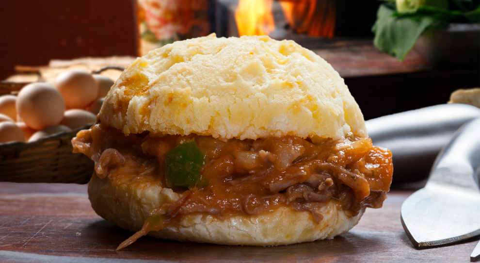 Pão de queijo recheado com costela assada e molho de goiabada Cascão picante e defumada