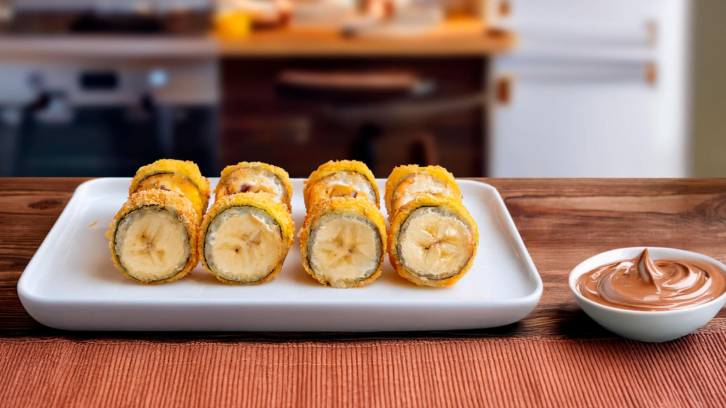 O hot roll de banana é uma deliciosa surpresa. É uma receita que equilibra o doce da fruta com o salgado do arroz e da alga. Serve como uma ótima escolha de entrada ou petisco que combina a suavidade da banana com a crocância do empanado.
