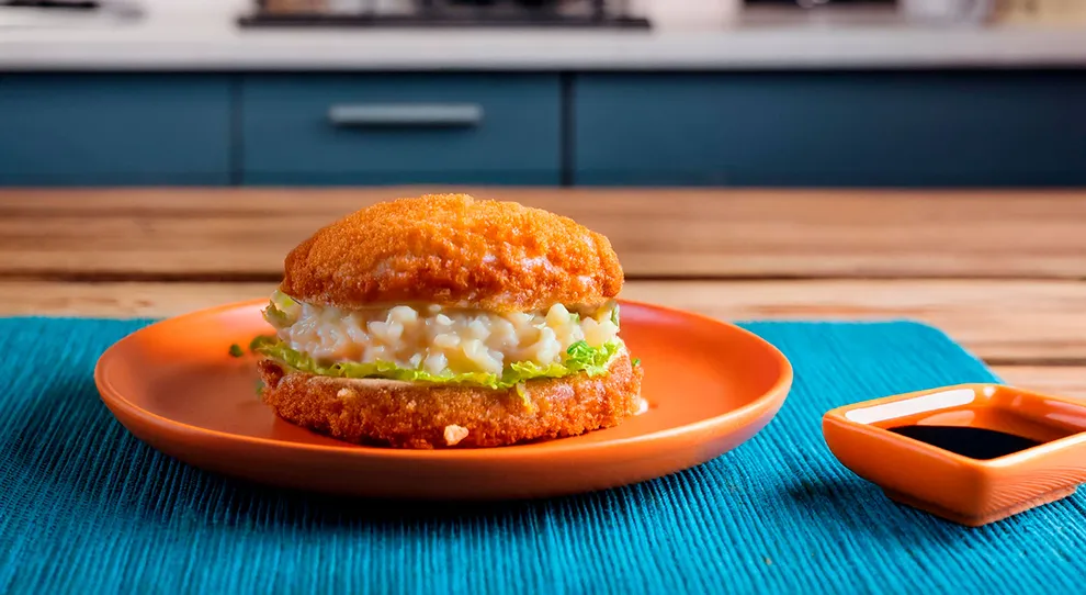 - Para montar o sushi burguer, utilize um filé de salmão à milanesa como base.