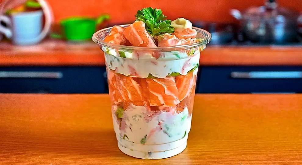 - Faça camadas de arroz, salmão e pepino até preencher todo o copo.
