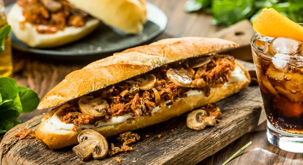 A combinação do jerked beef desfiado com cebolas caramelizadas e cogumelos salteados traz um toque de sofisticação e transforma cada mordida em uma experiência única e cheia de sabor! A dica é montar o sanduíche de carne desfiada em uma baguete crocante e ainda preparar batatinhas fritas crocantes na airfryer para acompanhar!