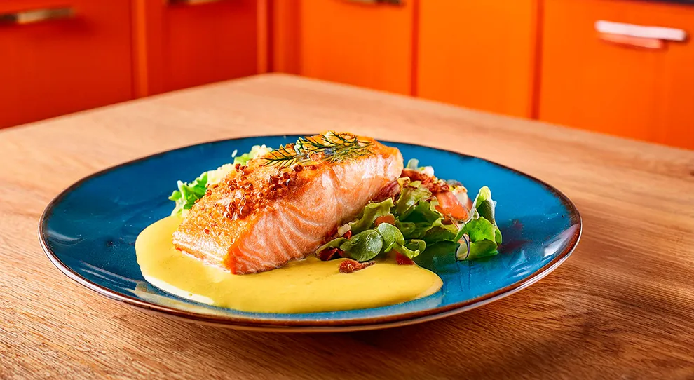 Experimente uma salada de batata com bacon extra pernil crocante como acompanhamento da deliciosa posta de salmão ao molho de mostarda. A cremosidade da batata combina com o sabor defumado do bacon e a crocância do pernil e cria um equilíbrio perfeito com a suavidade e o toque marcante da mostarda no salmão.
