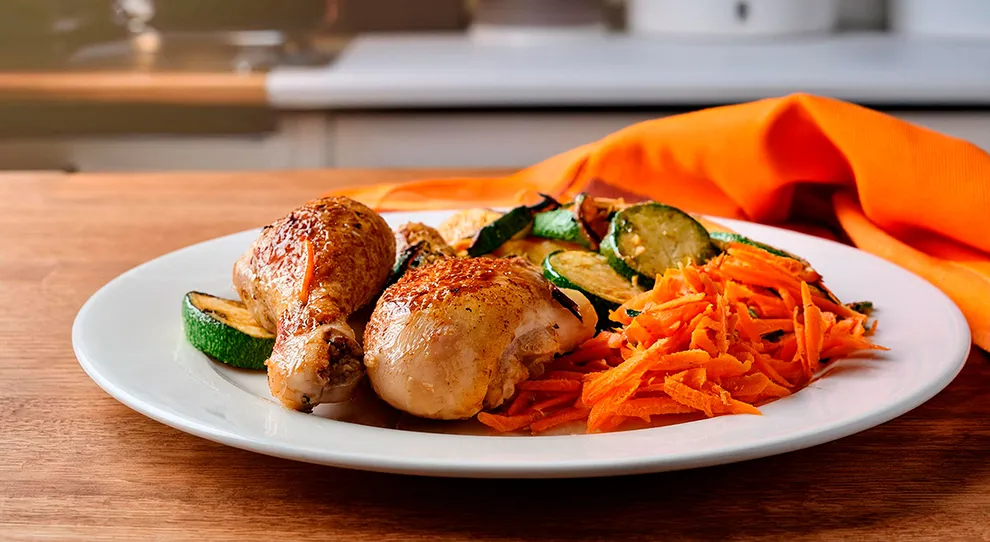 - Coloque as coxas de frango sobre os legumes e regue tudo com azeite.