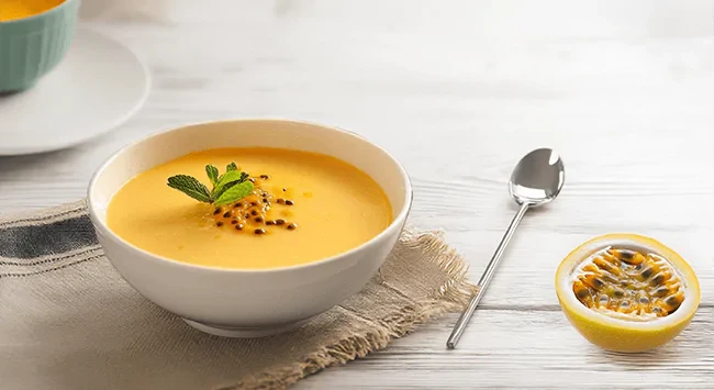 Para preparar uma mousse simples no almoço de domingo, você não precisa de muitos ingredientes, apenas creme de leite, suco de maracujá da fruta, gelatina incolor, açúcar e leite condensado. O preparo é feito no liquidificador e vai para a geladeira por no mínimo 4 horas, até que esteja firme.