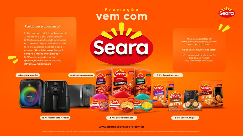 Agosto de 2025 – Depois do sucesso da primeira fase, em que sorteou pares de ingressos para o The Town, a promoção “VEM COM A SEARA” entra em nova etapa com mais de 40 prêmios. A segunda fase, que já está ativa, sorteará kits incluindo eletrodomésticos da Mondial, como air fryers e micro-ondas, e produtos Seara para quem se inscrever até o dia 21 de agosto.