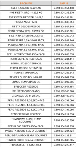 Todos os produtos listados na tabela são produtos Natalino Seara ou Seara Gourmet.